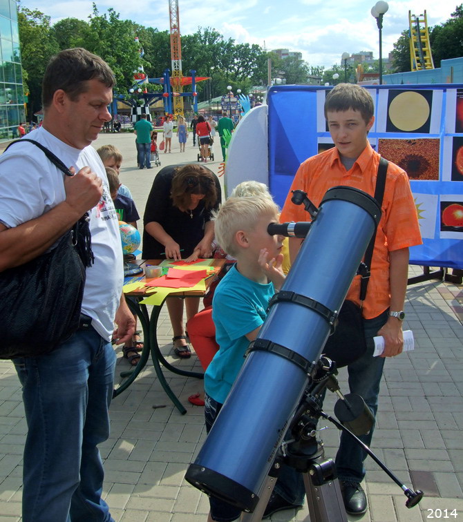 22.06.2014 в парку ім. Горького співробітники Харківського планетарію ім. Ю.А. Гагаріна проводили демонстраційні спостереження сонячних плям в телескоп (спеціальний фільтр), а також розповідали про сонячну активність.
